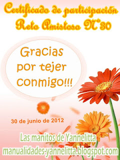 Hola Erica, te doy la bienvenida al Reto Amistoso Nº30 y te agradezco por acompañarme en este mi primer reto como organizadora, estoy muy feliz y agradecida,Gracias por publicar mi logo en tu blog y espero que te diviertas tejiendo junto a muchas amigas.