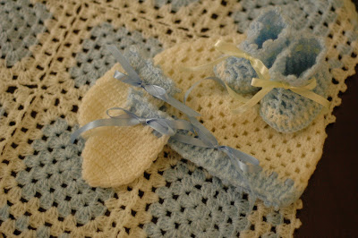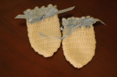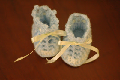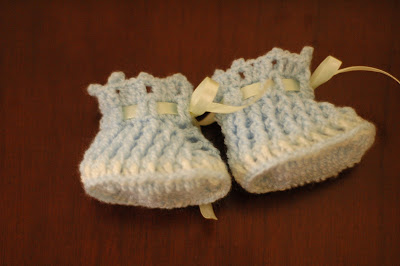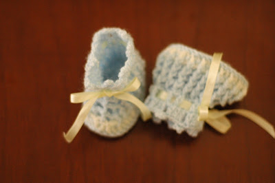Sapatinhos: A pedido do cliente, fiz com lã azul com detalhe e fita de cetim na cor creme. Não tenho gráfico porque aprendi direto com a professora D.Rita, colega de voluntariado.